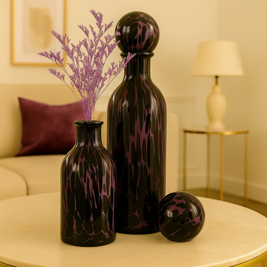 Round Black & Purple Glass Vase with Stopper Top