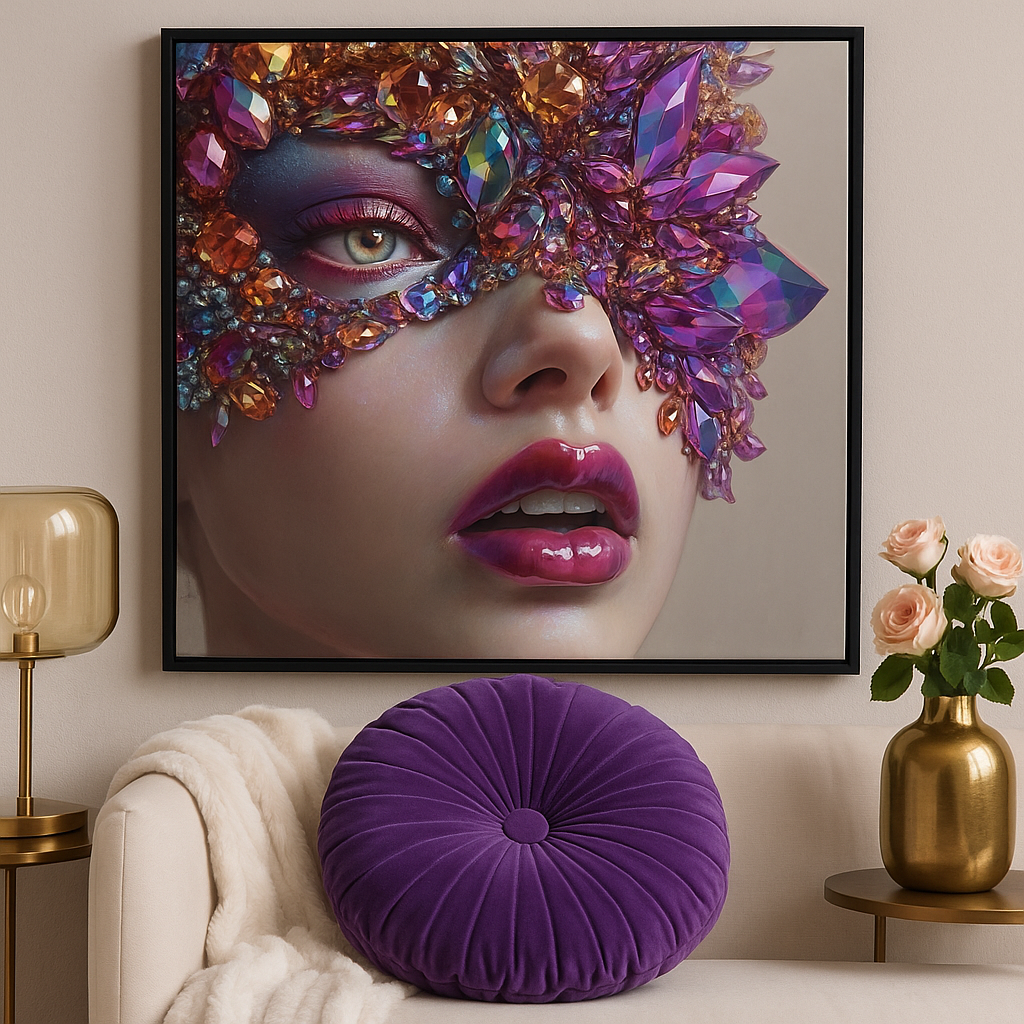 This 70x70cm Glam Crystal Mask Wall Art features a mesmerizing close-up of a woman's face adorned with an extravagant crystal-studded masquerade mask. With rich jewel tones of amethyst, ruby, and sapphire dancing in high-definition detail, this piece radiates glamour and fantasy.